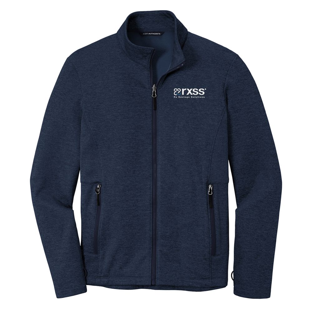 sku: RX-HR01A smooth face, brushed back and striated pattern come together to make this warm fleece jacket undeniably on-trend. The Port Authority® Striated Fleece Jacket is made up of 6.3-ounce, 95/5 polyester/spandex fleece and features a slightly longer length, a molded center front zipper, front reverse-coil zippered pockets and open cuffs and hem. Navy jacket with embroidered logo in White and RxSS Light Teal.